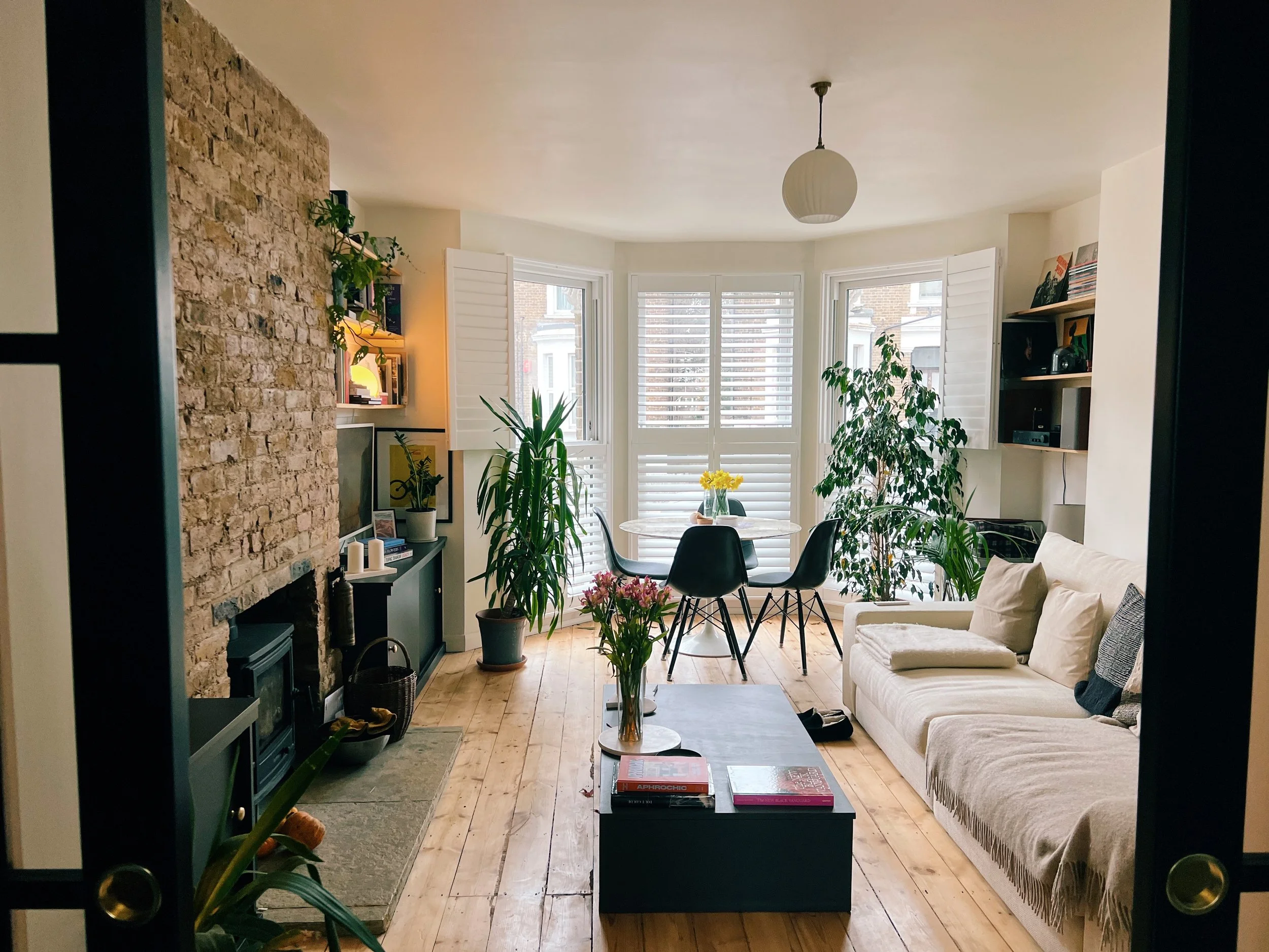 In redesigning this living space, we focused on maximising the existing features to create a cohesive environment between the kitchen and living room. We restored the chimney breasts of this beautiful Victorian property, exposing the brick to enhance the cozy atmosphere and added a beautiful range oven and log burner. The original wooden floor was refurbished to bring back its charm, while dark grey cabinetry in the kitchen paired with bespoke cabinets made from spare materials in the living room beautifully unifies the spaces. Brass accents throughout add both elegance and warmth, complemented by floating shelves decorated with books, plants, and decorative items.